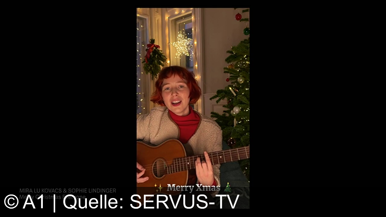Eine Person mit rotem Haar spielt Gitarre. Sie trägt einen roten Rollkragenpullover und eine beige Strickjacke. Im Hintergrund steht ein geschmückter Weihnachtsbaum mit Lichtern. Der Raum ist weihnachtlich dekoriert mit einem Sternlicht am Fenster. Text zeigt "Merry Xmas" mit Icons von einem Stern und einem Weihnachtsbaum. Links unten stehen die Namen Mira Lu Kovacs & Sophie Lindinger.