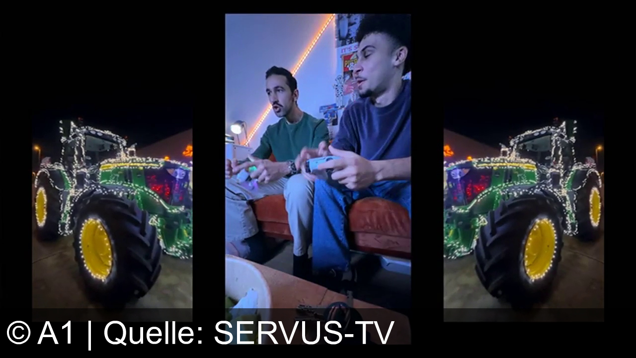 Zwei Männer sitzen auf einem Sofa und spielen Videospiele mit Controllern. Im Hintergrund hängen Poster an der Wand. Nebenaufnahmen zeigen einen grünen Traktor, der mit Lichterketten geschmückt ist. Auf einem Tisch liegen eine Schüssel mit Snacks und ein Schlüsselbund. Die ganze Szene ist in einem Raum mit sanfter Beleuchtung.