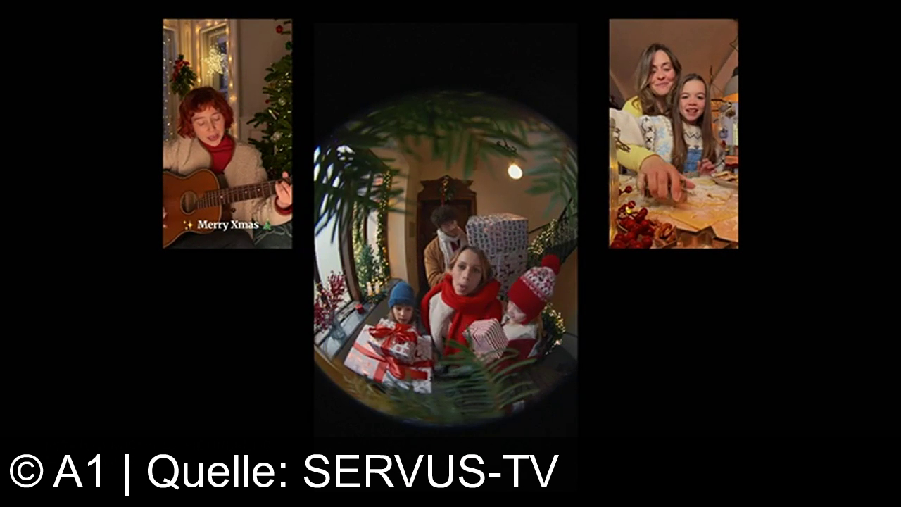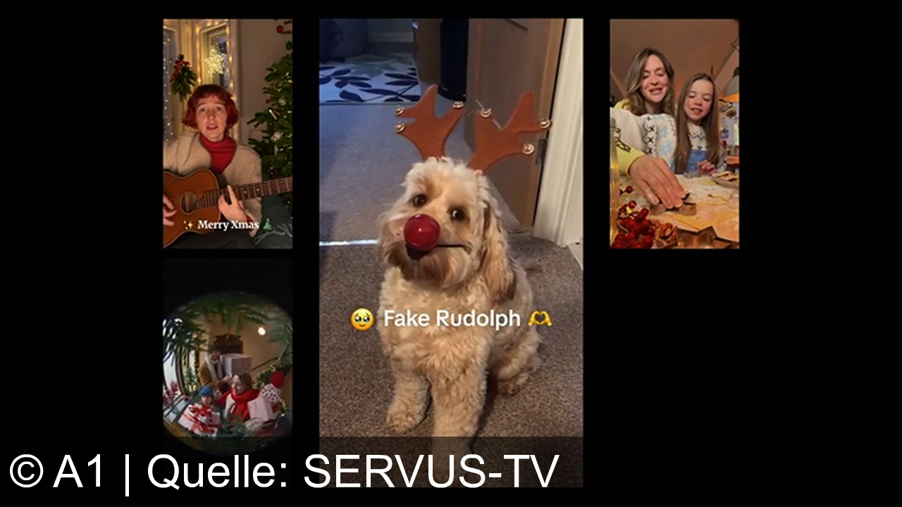Mehrere Bilder in einem Werbespot, der Hund in der Mitte trägt rote Nase und Geweih mit dem Text "Fake Rudolph". Links oben spielt eine Person Gitarre vor einem Weihnachtsbaum. Unten links mehrere Kinder bei Geschenken. Rechts oben und Mitte zwei Personen backen und lachen. Weihnachtliches Ambiente.
