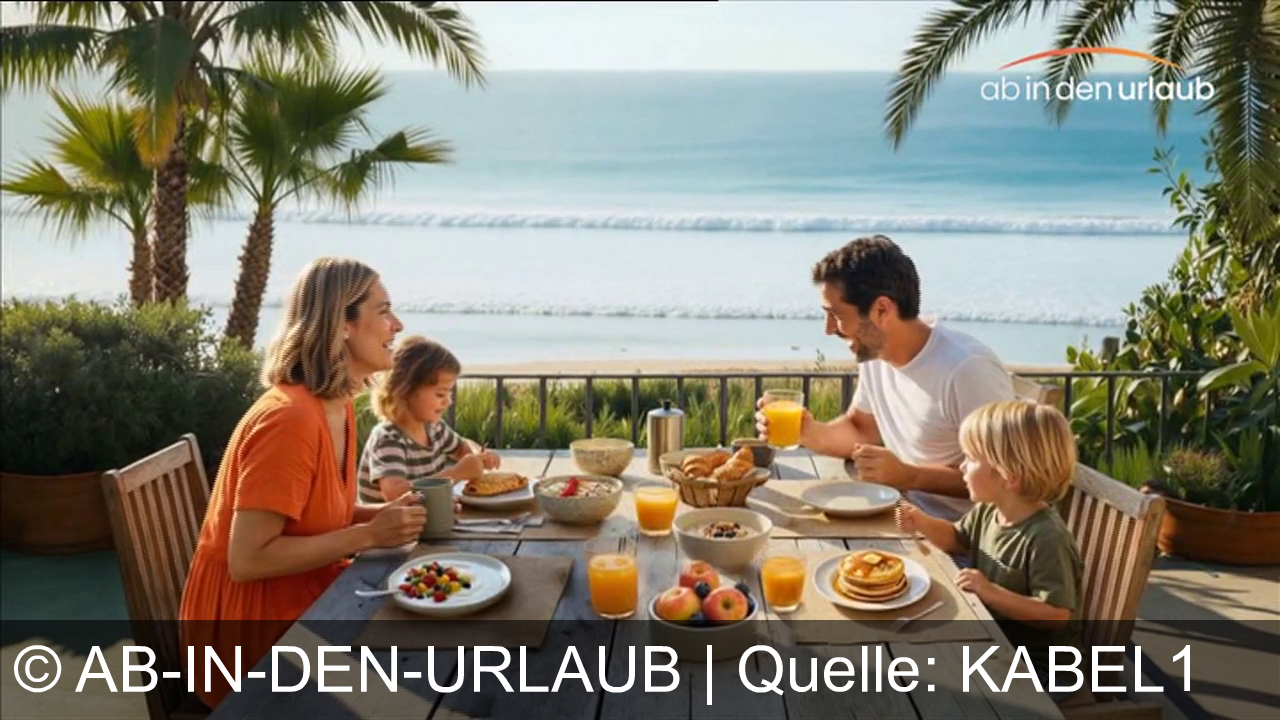 Eine Familie sitzt an einem Tisch im Freien mit Blick auf das Meer. Der Tisch ist gedeckt mit Orangensaft, Pancakes, Früchten und Gebäck. Palmen und Pflanzen sind im Hintergrund zu sehen. Ein Mann, eine Frau und zwei Kinder lächeln und unterhalten sich. Links oben steht "ab in den urlaub".