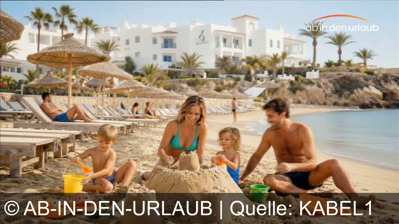 Eine vierköpfige Familie sitzt am Sandstrand und schaut auf den Sonnenuntergang über dem Meer. Links liegen orangefarbene Sandalen. Im Hintergrund, auf einer Klippe, stehen weiße Gebäude mit Palmen. Am Himmel sind Wolken, und die Sonne spiegelt sich auf dem Wasser. Oben rechts steht "ab in den urlaub".