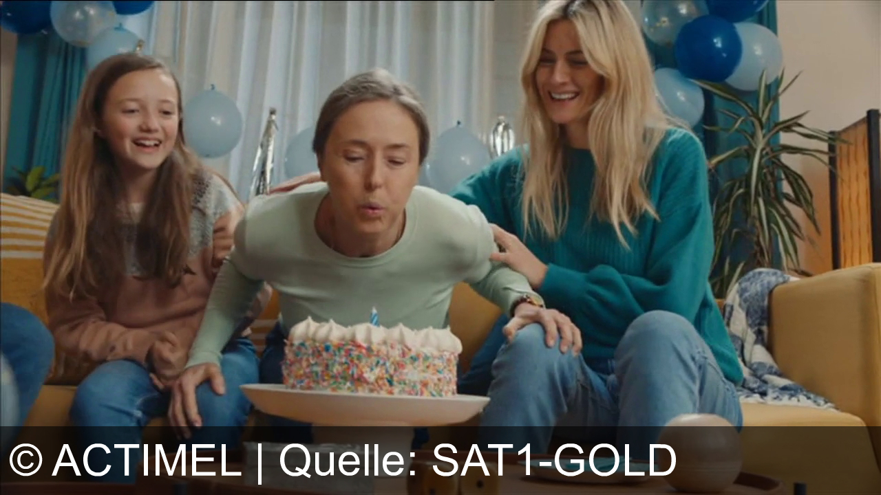 Drei Personen sitzen auf einem Sofa. Die Person in der Mitte bläst die Kerze auf einem bunten Kuchen aus, während die anderen beiden lachen. Eine Frau hat lange blonde Haare, die andere ein grünliches Oberteil. Im Hintergrund sind Ballons und eine Pflanze zu sehen.