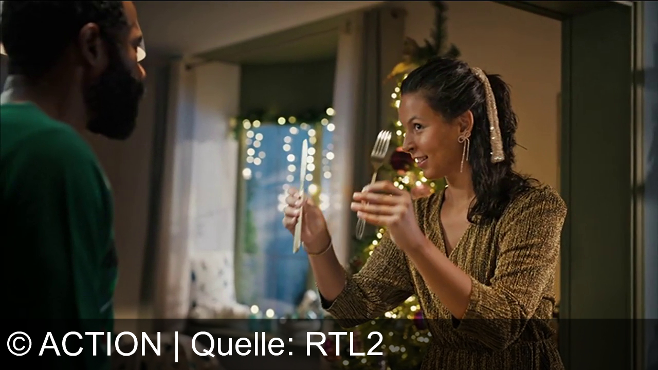 Eine Frau in einem goldenen Kleid hält Messer und Gabel in den Händen. Sie lächelt einen Mann an, der einen grünen Pullover trägt. Im Hintergrund steht ein geschmückter Weihnachtsbaum und Lichterketten sind sichtbar. Es ist gemütlich dekoriert.