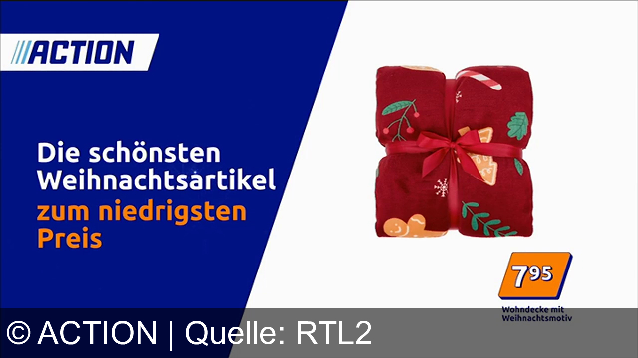 Links blaues Feld mit Text: "Die schönsten Weihnachtsartikel zum niedrigsten Preis." Rechts rote Decke mit Weihnachtsmotiven und Schleife. Preisangabe unten: "7,95." Oben links Logo in Blau mit Schrift: "ACTION." Unten rechts: "Wohndecke mit Weihnachtsmotiv."