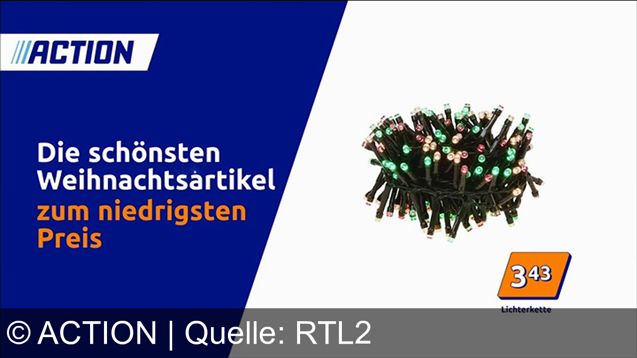 Blauer Hintergrund mit weißem und orangefarbenem Text: "Die schönsten Weihnachtsartikel zum niedrigsten Preis". Rechts ein Bild von bunten Lichterketten. Preis: 3,43 Euro. Oben links das Logo von "ACTION".