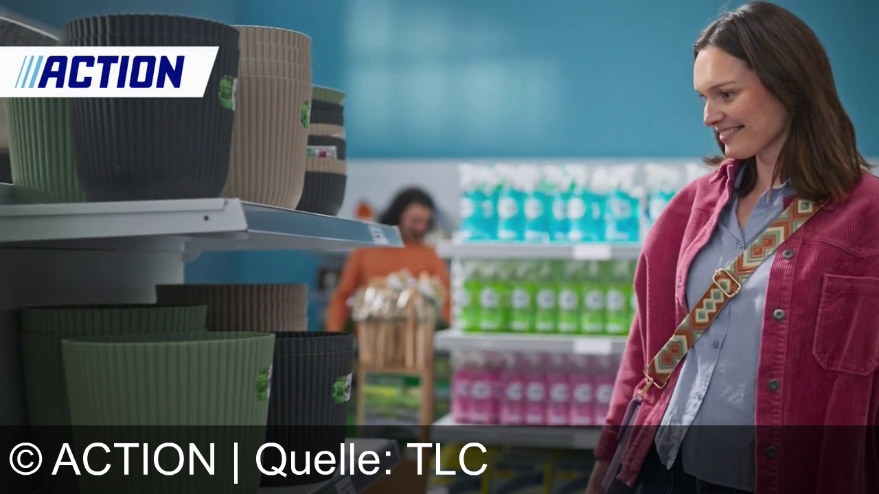 Eine Frau in rosa Jacke steht vor einem Regal mit Pflanztöpfen in einem Laden. Im Hintergrund sind Regale mit Reinigungsprodukten in bunten Flaschen. Ein Mann im orangefarbenen Pullover steht im Hintergrund. Oben links ist das Logo "ACTION" zu sehen. Die Szene wirkt hell und freundlich.