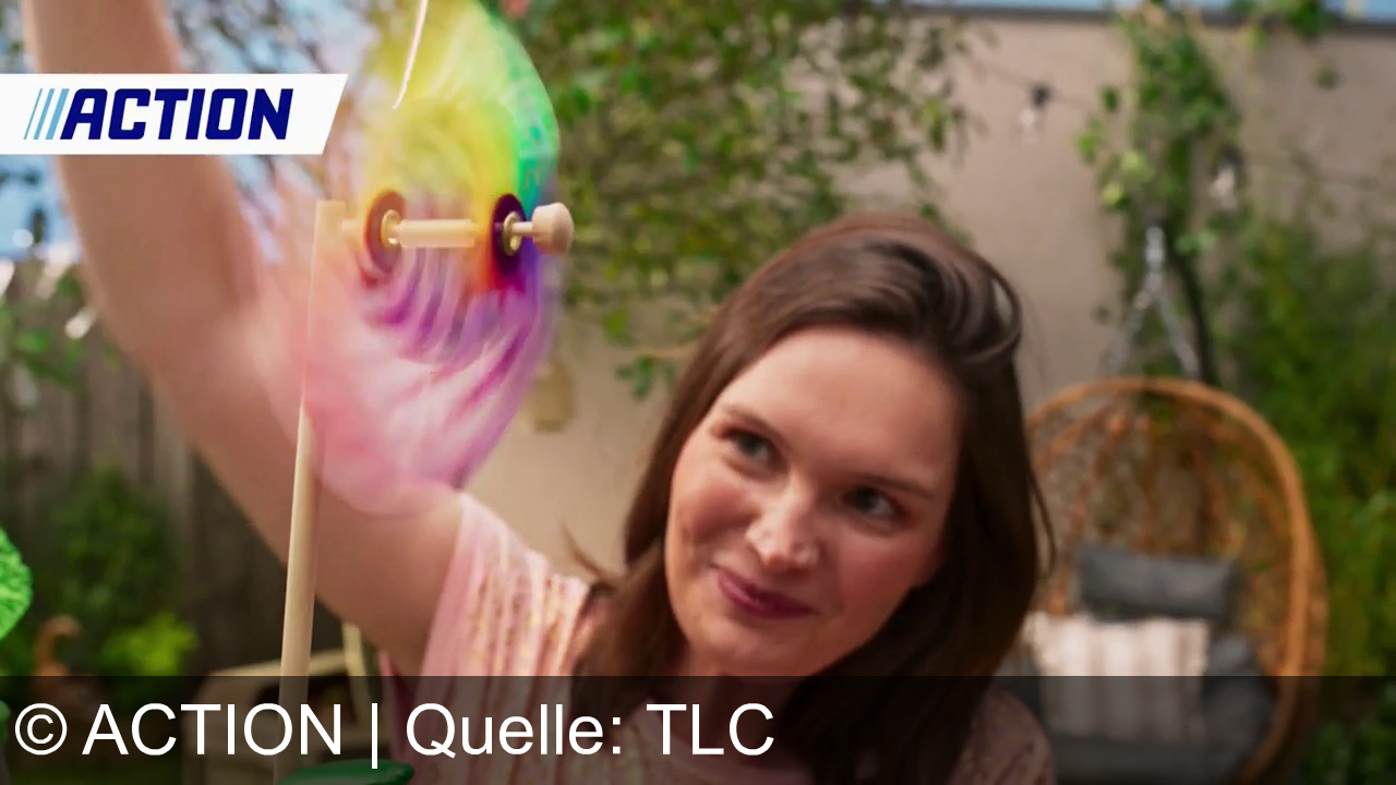 Eine Frau in rosa T-Shirt hält ein buntes, drehendes Windrad in der Hand. Im Hintergrund sind Pflanzen und ein runder Hängesessel zu sehen. Oben links steht das Wort "ACTION".