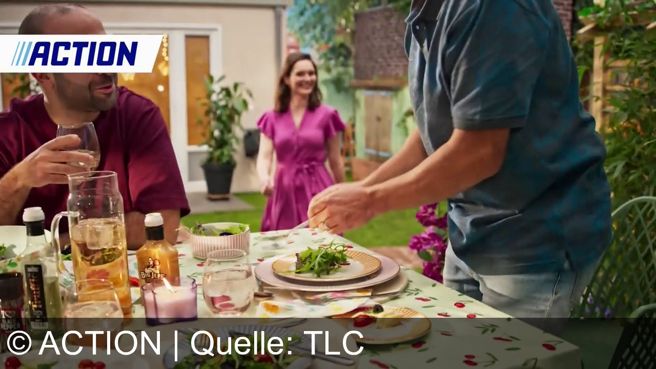 Eine Gruppe von Leuten sitzt im Garten an einem Tisch. Eine Person in einem blauen Hemd richtet einen Salatteller an. Eine Frau im pinken Kleid lächelt und geht auf die Szene zu. Auf dem Tisch stehen Gläser, eine Karaffe mit Getränk, Salat und verschiedene Flaschen. Eine Kerze brennt auf dem Tisch mit einem Muster aus Kirschen. Eine "ACTION"-Grafik ist oben links im Bild eingefügt.