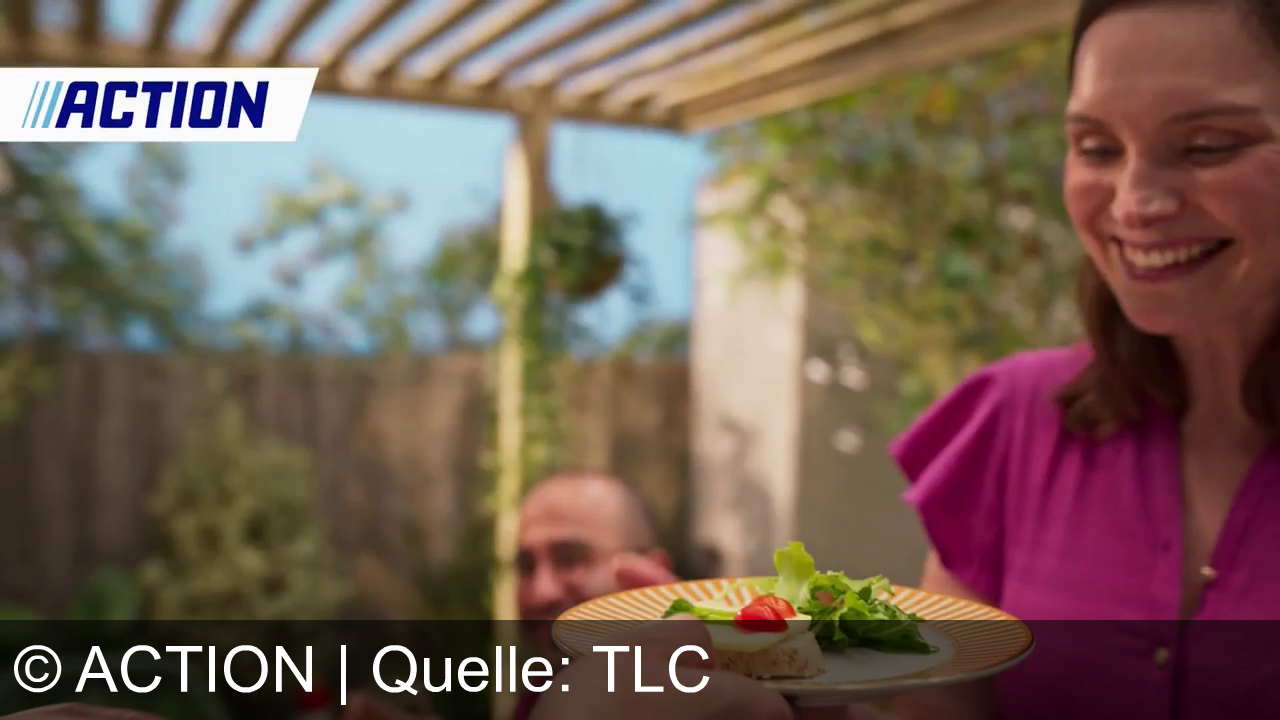 Eine Frau in einem lila Oberteil lächelt. Sie hält einen Teller mit einem belegten Sandwich und Salat. Im Hintergrund sitzt ein Mann. Eine Pergola über ihnen und Pflanzen sind sichtbar. Oben links steht "ACTION".