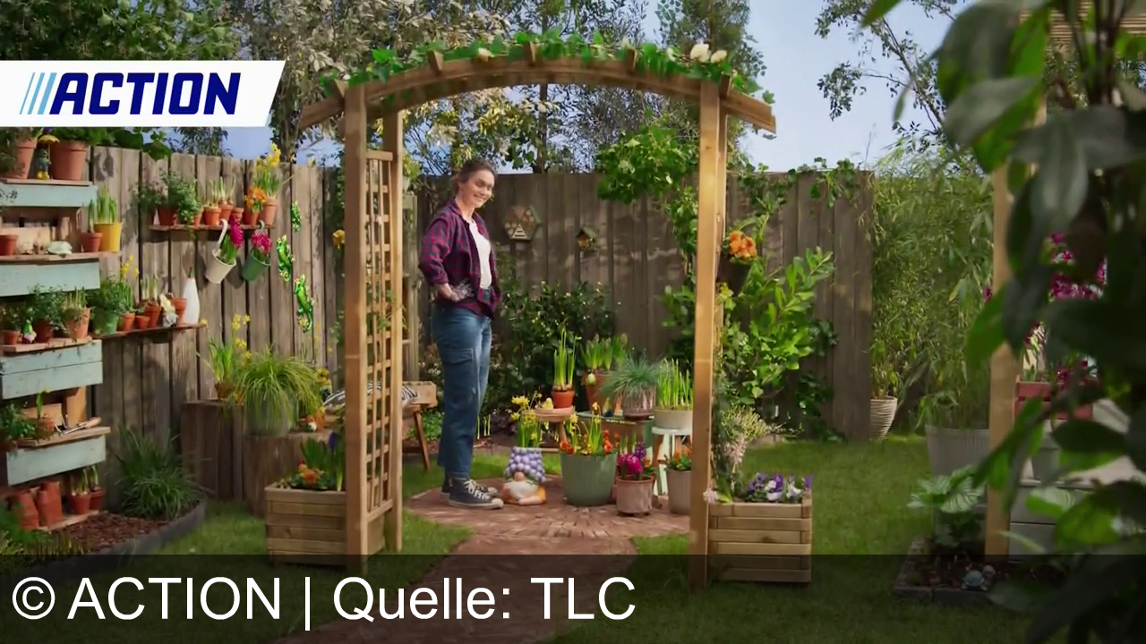 Eine Person steht unter einem Holzbogen im Garten. Überall sind Pflanzen in Töpfen und Blumenkästen. Eine Holzwand im Hintergrund, dekoriert mit Pflanzen. Ein Weg aus Steinplatten führt durch den Garten. Die Person trägt eine karierte Jacke, Jeans und Sneaker. Oben links steht "ACTION" in blau auf weißem Hintergrund.
