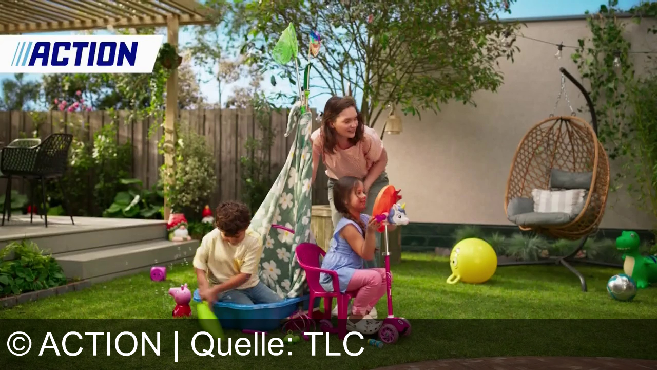 Im Garten spielen zwei Kinder. Der Junge sitzt an einem kleinen Planschbecken mit Spielzeug, das Mädchen sitzt auf einem pinken Stuhl mit einem Roller daneben. Eine Frau steht lachend hinter ihnen. Überall liegen bunte Spielzeuge und ein großer gelber Ball. Eine Sitzschaukel hängt rechts im Bild. Im Hintergrund ist eine Terrasse mit Pflanzen zu sehen. Oben links steht "ACTION".