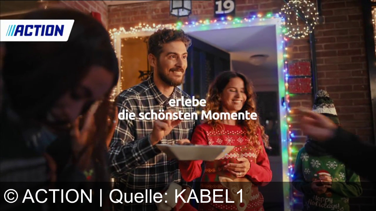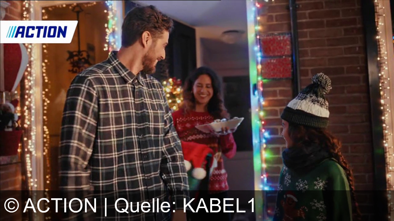 Drei Personen stehen in einer festlich beleuchteten Haustür. Der Mann trägt ein kariertes Hemd, die Frau dahinter hält einen Teller. Ein Kind mit Mütze und Weihnachts-Pullover steht daneben. Die Umgebung ist mit Lichterketten geschmückt und ein Weihnachtsbaum im Hintergrund erkennbar. Links oben steht "ACTION".
