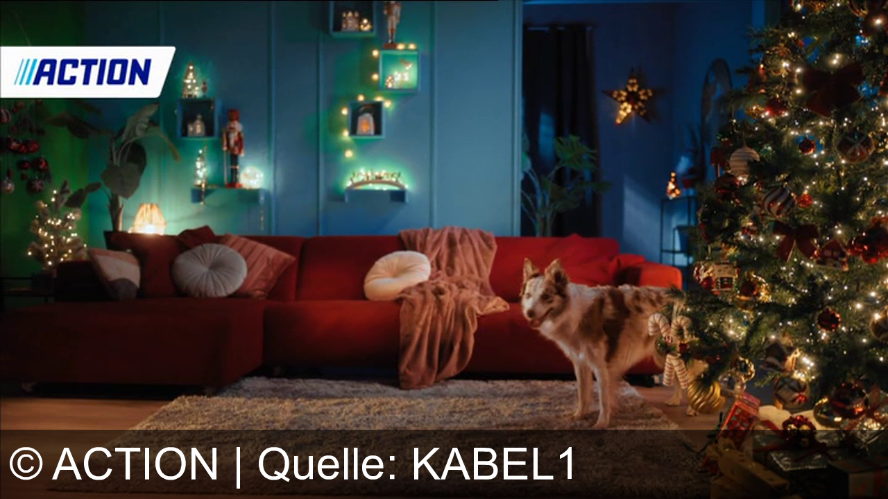 In einem gemütlichen Wohnzimmer steht ein geschmückter Weihnachtsbaum. Ein Hund sitzt vor dem Baum. Links steht ein rotes Sofa mit vielen Kissen und einer Decke. An der Wand leuchten Regale mit kleinen Deko-Objekten. Ein großer weißer Teppich liegt auf dem Boden. Links oben das Logo von "ACTION".