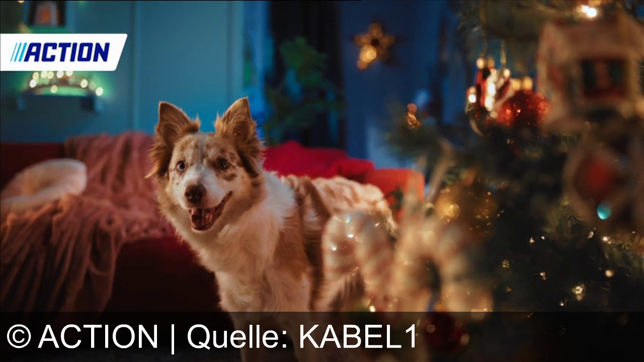 Ein Hund steht fröhlich in einem Wohnzimmer mit Weihnachtsdekorationen. Im Vordergrund ein geschmückter Weihnachtsbaum mit Lichtern und Kugeln. Im Hintergrund ein rotes Sofa, darauf eine Decke. Oben links das Logo "ACTION" mit blauem Schriftzug. Es ist festlich dekoriert mit warmem Licht.