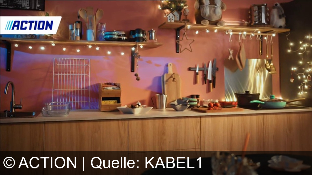 Küche mit Lichterketten, Holzregale mit Deko und Küchenutensilien, wie Schneidebretter und Messer. Links Wasserhahn, Schüssel auf Arbeitsplatte, Gemüse und Töpfe rechts. Logo "ACTION" oben links.