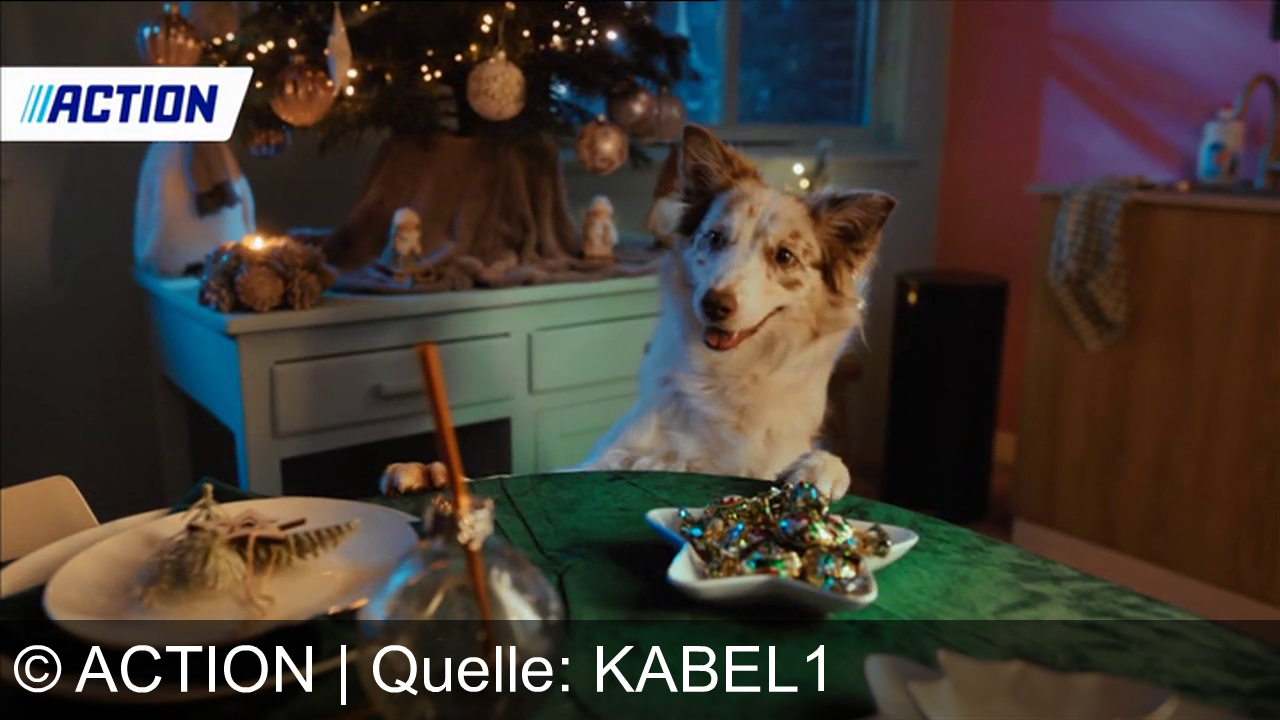 Ein Hund sitzt an einem Tisch mit einem grünen Tischtuch. Auf dem Tisch stehen ein Teller mit Spaghetti und eine sternförmige Schale mit Süßigkeiten. Im Hintergrund ein geschmückter Weihnachtsbaum mit Lichtern und Kugeln. Links oben das Logo „Action“.