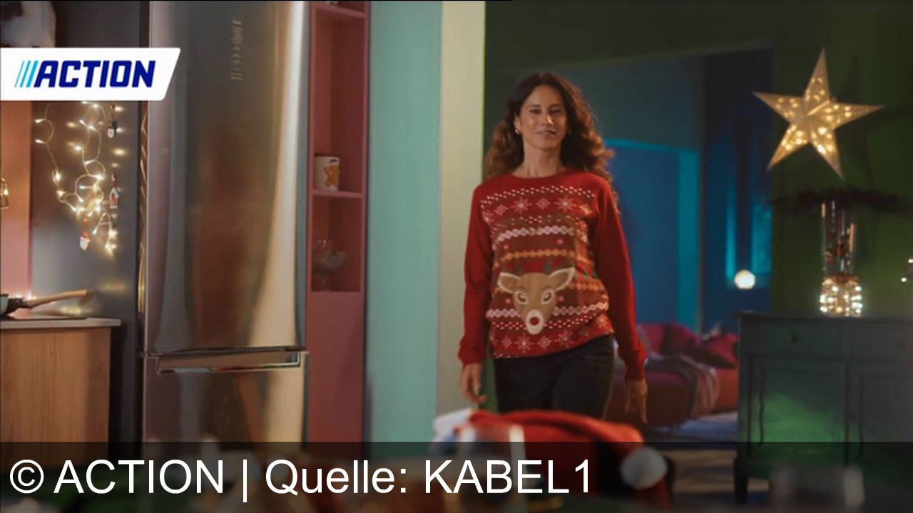 Eine Frau trägt einen roten Weihnachtspullover mit Rentiermotiv. Sie steht in einem Raum, der weihnachtlich dekoriert ist. Links ein Kühlschrank, daneben Lichterketten. Auf dem Tisch vorne liegt eine Weihnachtsmütze. Im Hintergrund erscheinen ein Sofa und ein großer beleuchteter Stern an der Wand. Oben links das Logo "ACTION".
