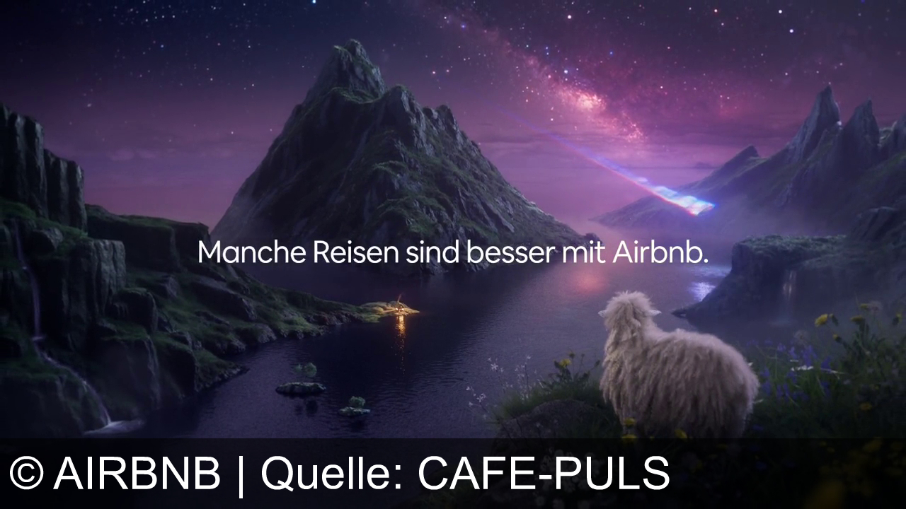 Ein Schaf steht auf einer Wiese und blickt auf einen See mit Bergen im Hintergrund. Der Nachthimmel ist sternenklar. Ein heller Lichtstrahl zieht sich über den Himmel. In der Mitte des Bildes steht: "Manche Reisen sind besser mit Airbnb."