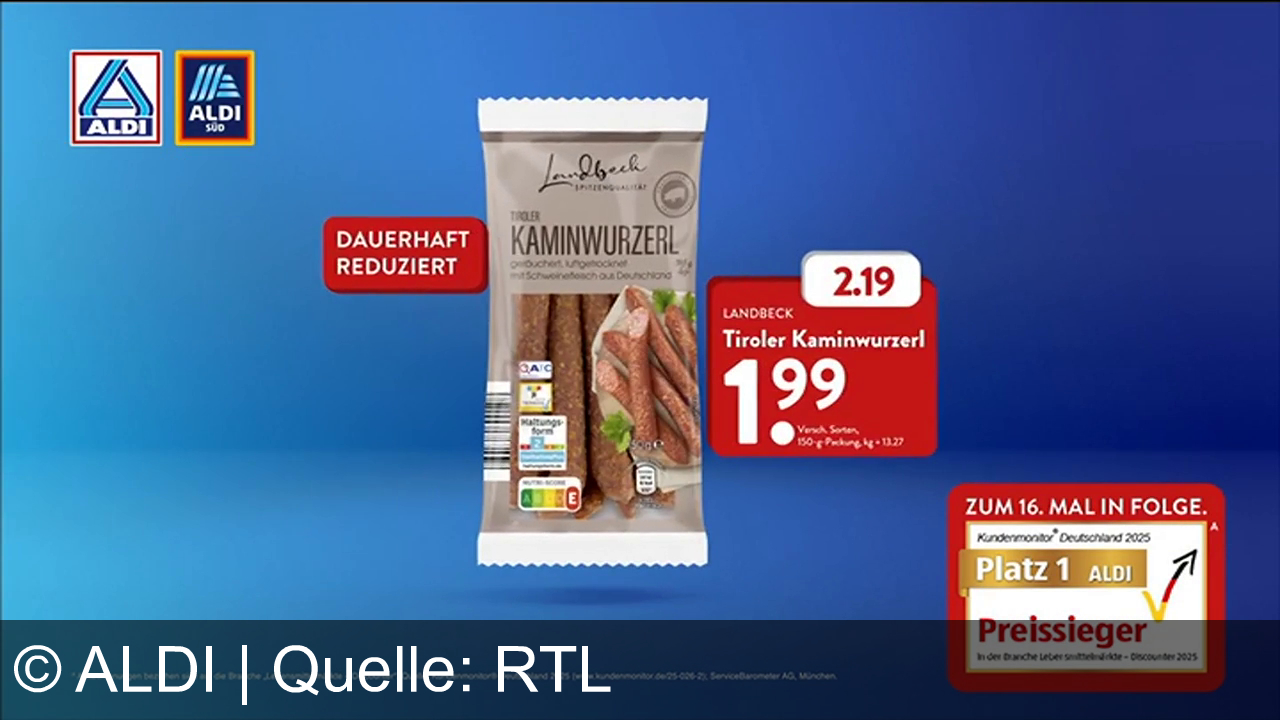 Aldi Werbung aus dem Jahr 2026 in Österreich, mit dem von uns gewählten Titel: "Gutes für alle: Original Aldi Preise und dauerhafte Preissenkungen bei ALDI" mit der Kurzbeschreibung: "Aldi: Deutschlands wahrer Preissieger! Landbeck Salametti und Tiroler Kaminwurzel jetzt dauerhaft reduziert. Gutes für alle.". Diese Werbung thematisiert oder beinhaltet die Kategorie/n Lebensmittel, Rabatt, Salami, Supermarkt
