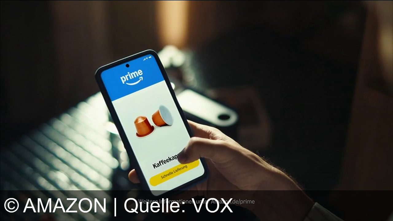 Der Amazon Prime Spot thematisiert die schnelle Verfügbarkeit von Alltagsgütern. Ein Mann bemerkt in seiner unordentlichen Küche den Mangel an Kaffeekapseln und Lebensmitteln wie Zwiebeln. Die zentrale Werbeaussage betont die Zuverlässigkeit des Prime-Versands, der Bestellungen bereits am Folgetag liefert und so den täglichen Bedarf deckt.