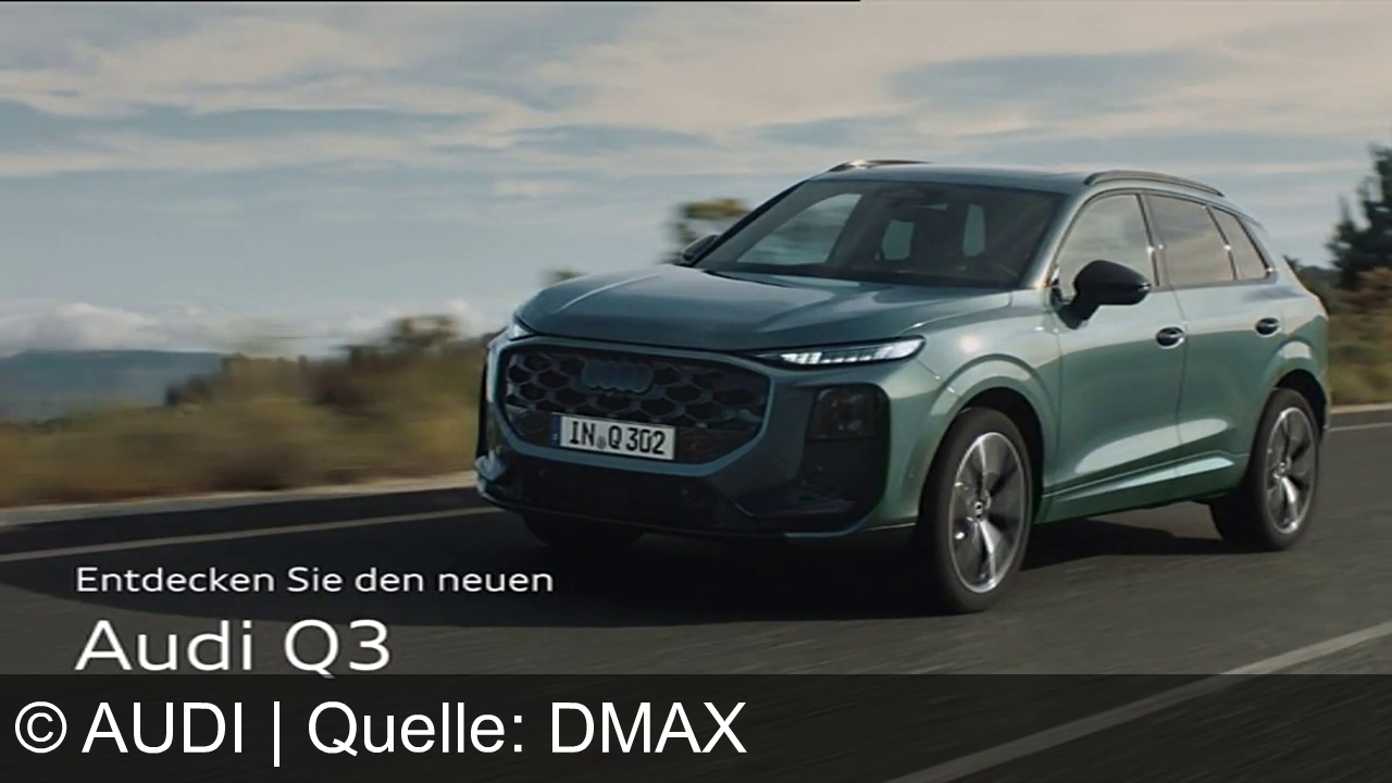 Ein grüner Audi Q3 fährt auf einer Straße. Im Hintergrund sind Bäume und blauer Himmel zu sehen. Auf dem Bildschirm steht der Text: "Entdecken Sie den neuen Audi Q3". Das Auto hat ein deutsches Kennzeichen mit "IN Q302". Die Aufnahme wirkt dynamisch, da das Auto in Bewegung ist.