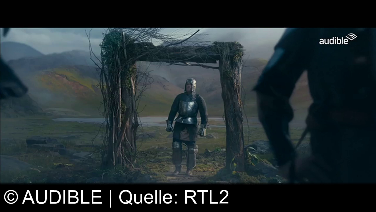 Ein Ritter in einer Rüstung steht vor einem Torbogen aus Holz und Ästen in einer weiten, grasbewachsenen Landschaft. Im Hintergrund sind Hügel und ein Fluss oder See zu sehen. Rechts im Vordergrund ist der teilweise sichtbare Arm einer zweiten Person. Oben rechts steht "audible".