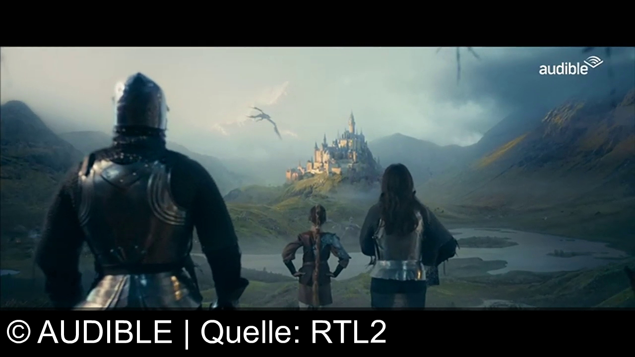 Drei Personen in Rüstung stehen in einer grünen Hügellandschaft. Im Hintergrund ein Schloss, über dem ein Drache fliegt. Der Himmel ist bewölkt. Oben rechts steht "audible".