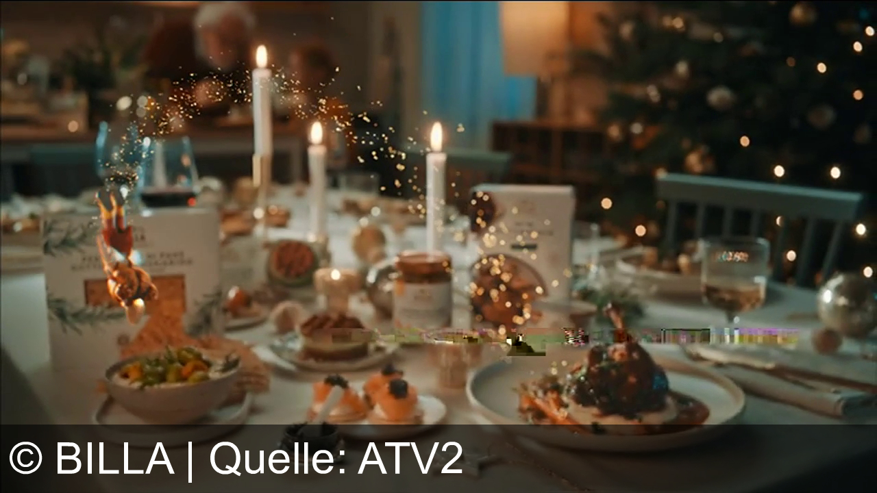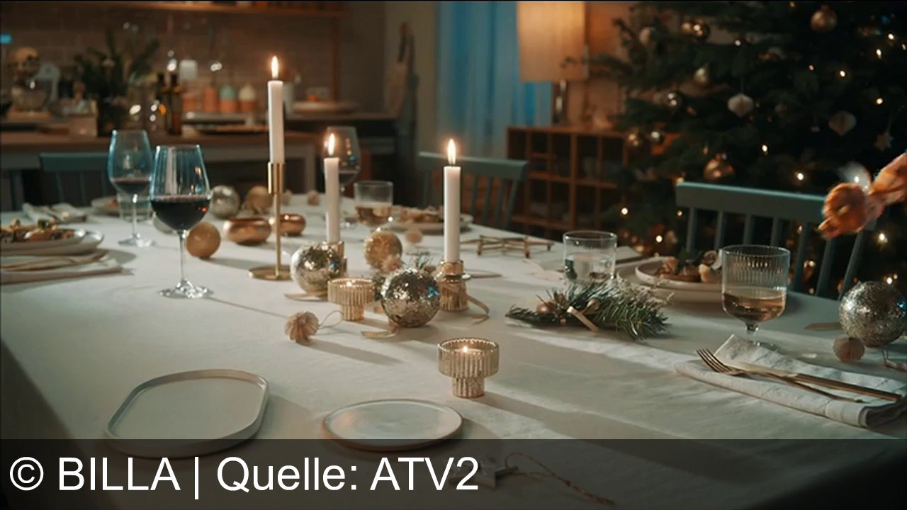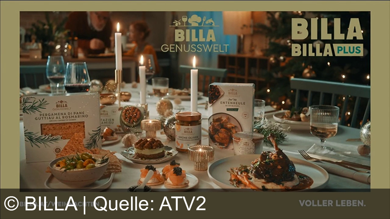 Ein festlich gedeckter Tisch mit mehreren Kerzen, Weingläsern und verschiedenen Gourmetprodukten von Billa. Im Hintergrund stehen verschwommen zwei Personen. Weihnachtliche Dekorationen und ein Weihnachtsbaum sind zu sehen. Textbausteine "BILLA GENUSSWELT", "BILLA PLUS", "BILLA.AT/WEIHNACHTEN" und "VOLLER LEBEN" sind eingeblendet.