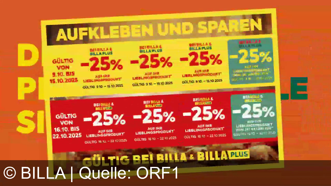 Rabatte bei Billa und Billa Plus: 25% auf Lieblingsprodukte. Gültig vom 9.10. bis 15.10.2025 und 16.10. bis 22.10.2025. Text auf orangefarbenem Hintergrund, gelb und rot hervorgehoben. Slogan "Aufkleben und Sparen".