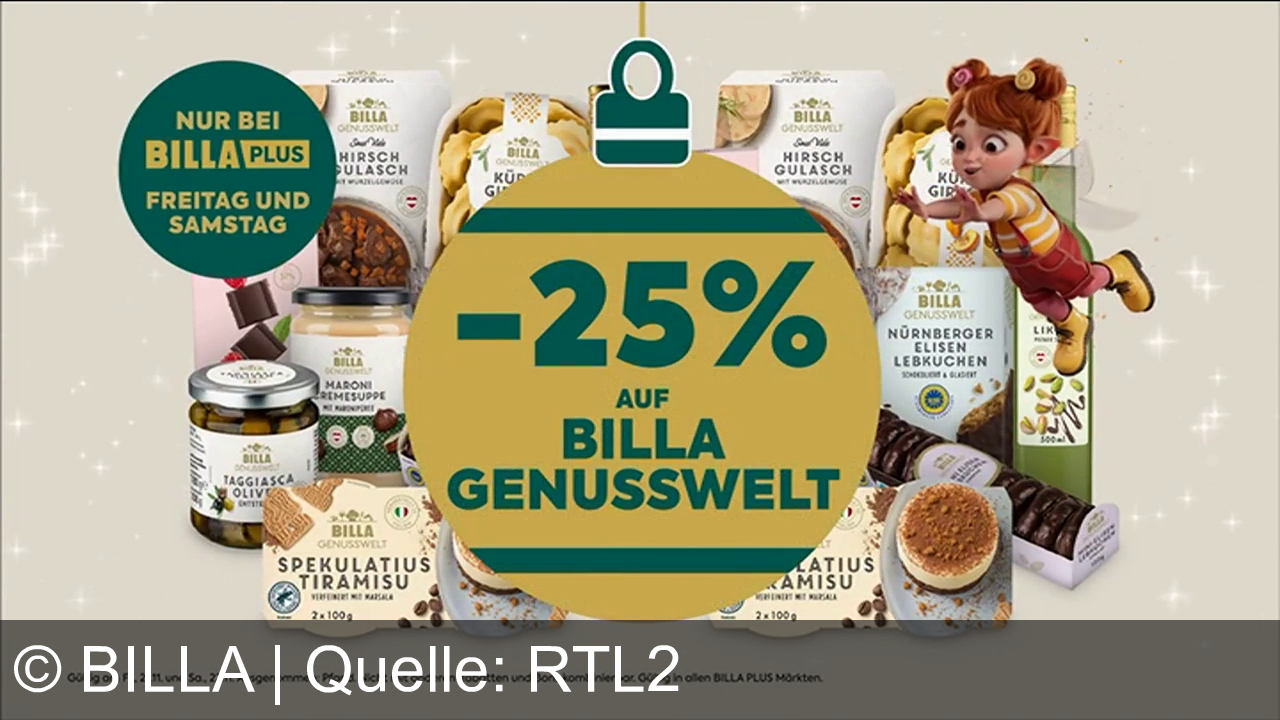 -25% Rabatt auf BILLA Genusswelt. Angebot gilt nur bei BILLA PLUS, freitags und samstags. Verschiedene Produkte wie Oliven, Gulasch und Tiramisu sind dargestellt. Ein kleiner animierter Charakter in bunter Kleidung ist oben rechts zu sehen. Gültig am Freitag, den 21.11. und Sonntag, den 22.11. Bedingungen ausgeschlossen.
