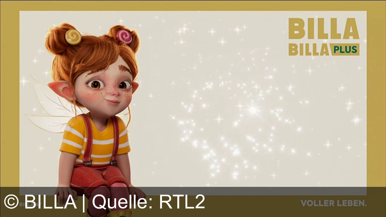 Ein animiertes Mädchen mit roten Haaren und Glitzerflügeln, trägt ein gestreiftes gelb-weißes Shirt und rote Hose. Es gibt glitzernde Sterne um sie herum. Oben rechts steht "BILLA BILLA PLUS". Unten links der Text "BILLA.AT" und unten rechts "VOLLER LEBEN". Alles ist von einem goldenen Rahmen umgeben.