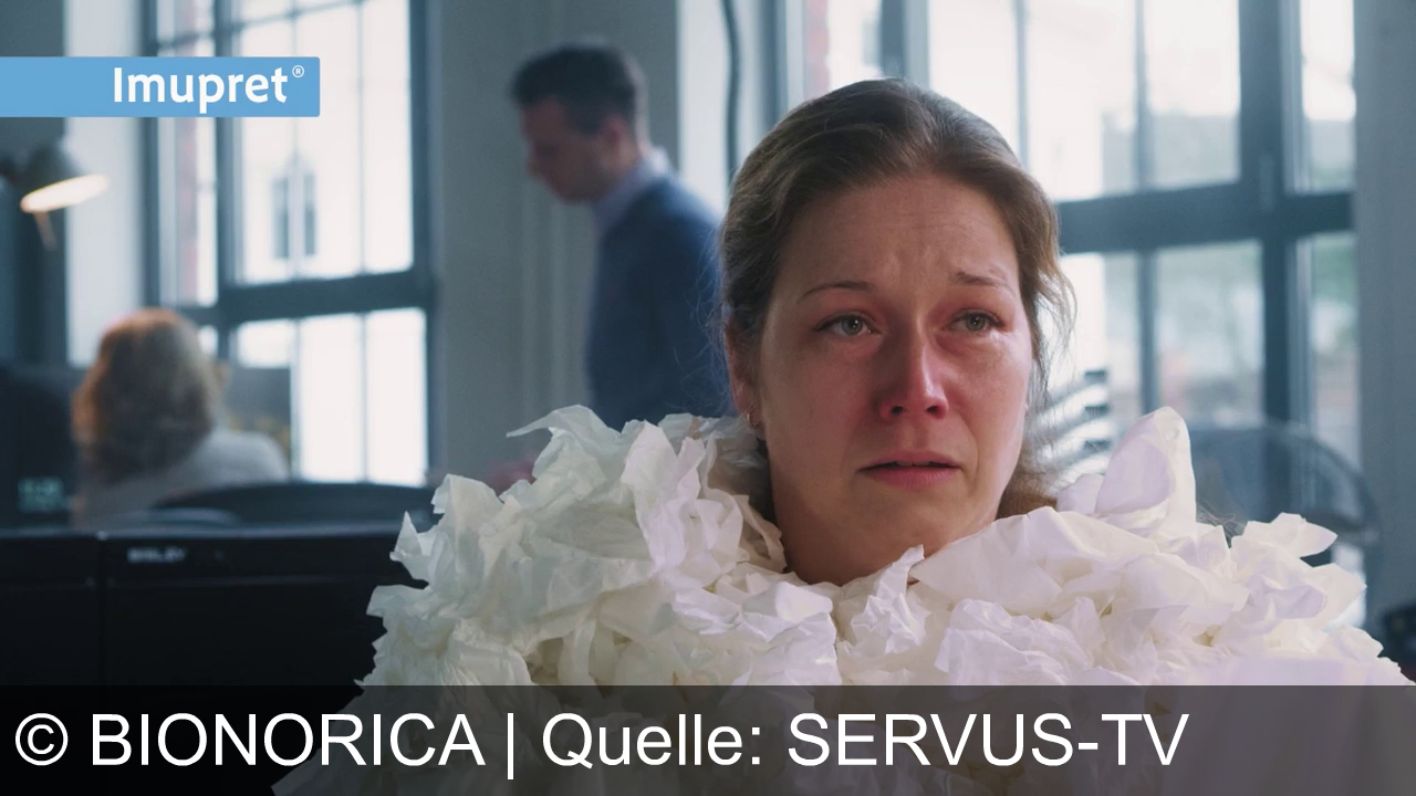 Eine Frau mit geröteten Augen ist von vielen weißen Papiertüchern umgeben. Im Hintergrund stehen und sitzen unscharf erkennbare Personen in einem Raum mit großen Fenstern. Oben links befindet sich ein blaues Rechteck mit dem Wort "Imupret®".