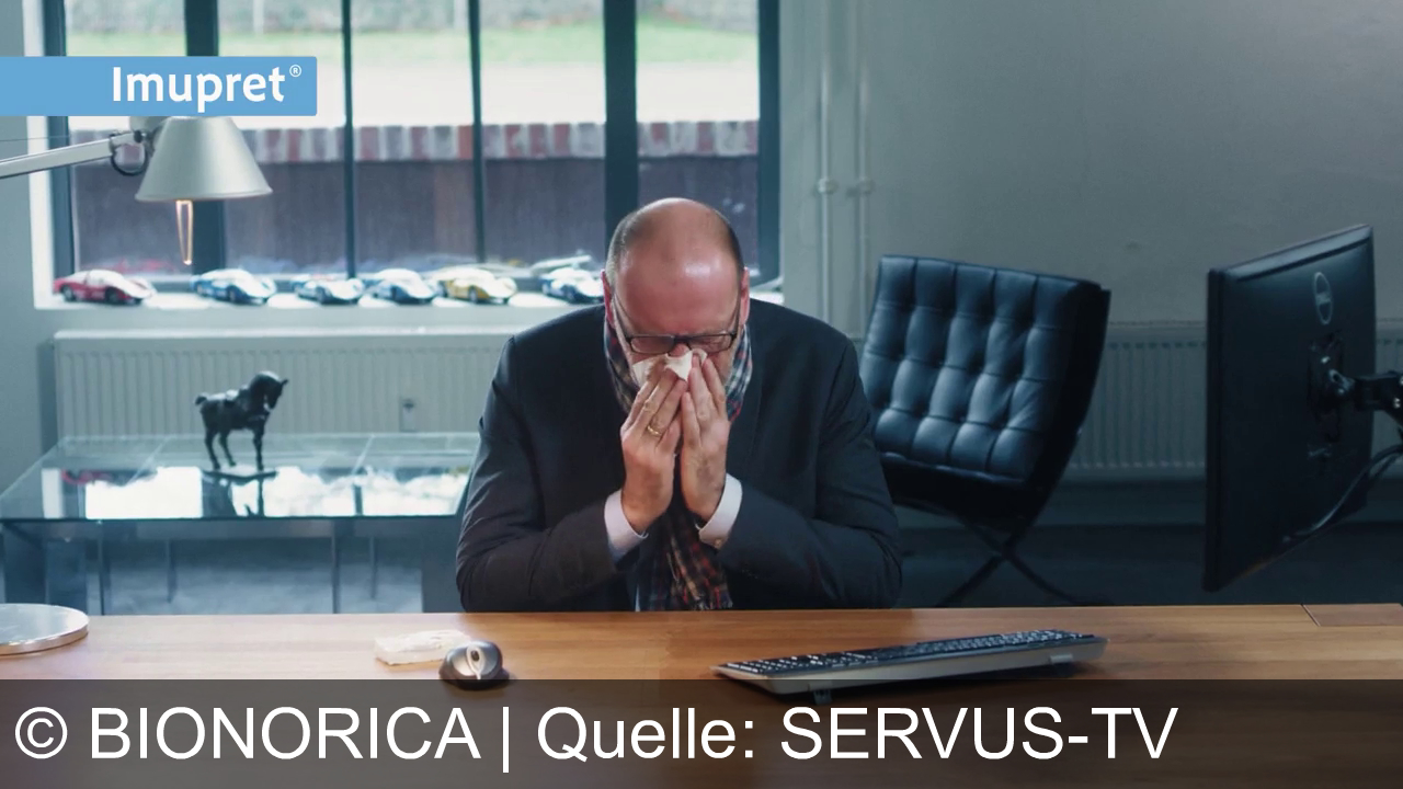 Ein Mann sitzt an einem Schreibtisch in einem Büro. Vor ihm liegen eine Computermaus und eine Tastatur. Er hält ein Taschentuch vor seinem Gesicht. Im Hintergrund stehen Modellautos auf einer Fensterbank. Eine Lampe hängt über dem Tisch. Eine schwarze Statuette steht auf einem Glastisch. Links oben ist das Wort "Imupret" zu sehen.