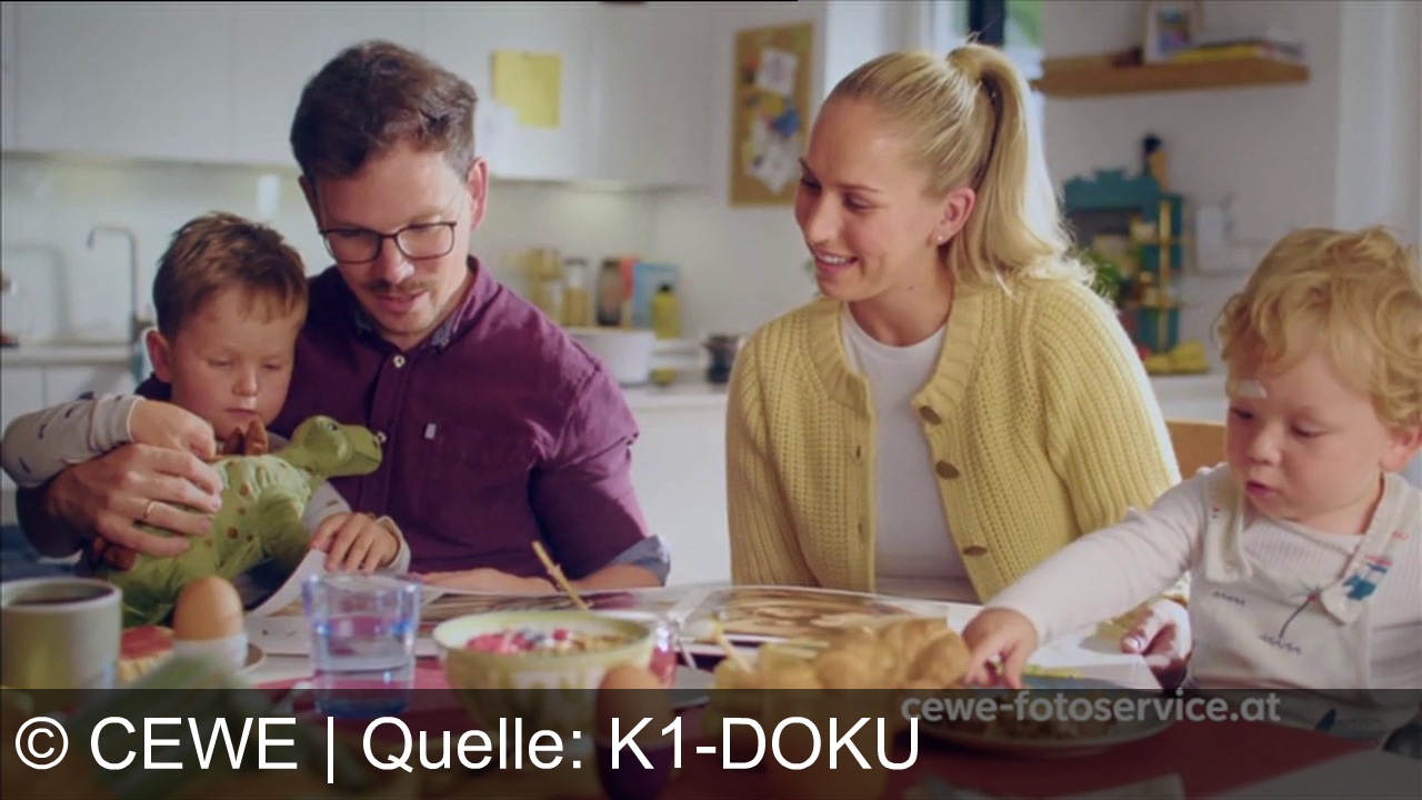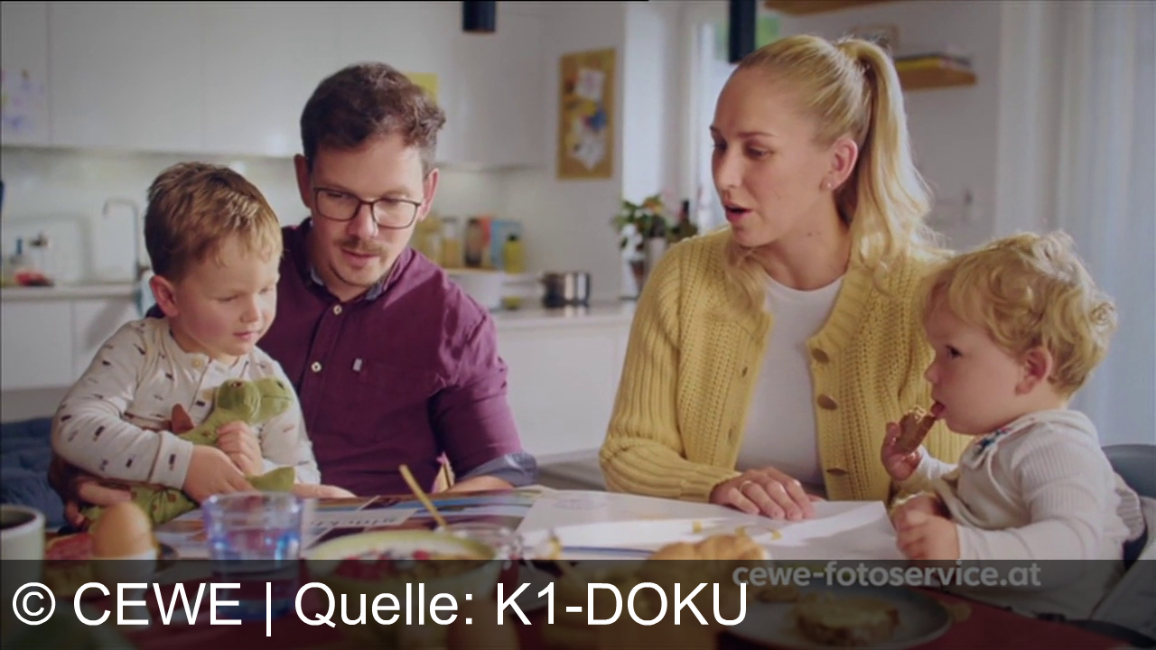 Eine Familie sitzt am Tisch beim Frühstück. Ein Mann mit Brille hält ein Kind auf dem Schoß, das mit einem Dinosaurier-Spielzeug spielt. Eine Frau mit blondem Pferdeschwanz sitzt daneben und lächelt. Auf dem Tisch sind Croissants, Saft, Eier und Joghurt zu sehen. Ein weiteres Kind ist mit Essen beschäftigt. In der Ecke steht "cewe-fotoservice.at".