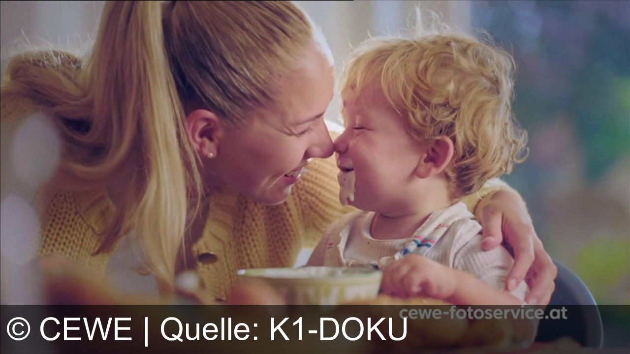 Eine Frau mit blondem Pferdeschwanz und ein Kind mit lockigem Haar lächeln sich an und berühren mit den Nasen. Beide sind nah beieinander. Das Kind sitzt vor einer Schüssel und trägt einen Latz. Im Bild steht "cewe-fotoservice.at".