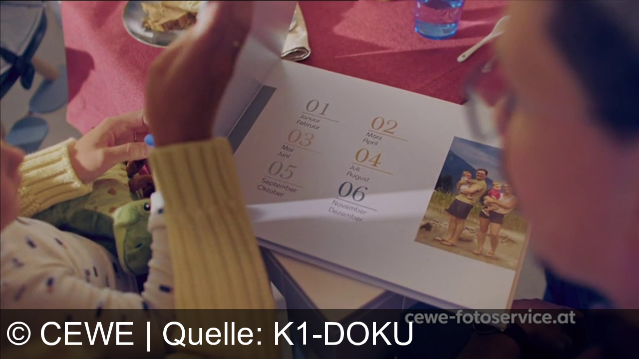 Eine Person blättert in einem Fotobuch. Links im Buch stehen Monatsnamen wie Januar bis Dezember, rechts ist ein Foto von zwei Menschen mit Kindern vor einer Waldlandschaft. Im Hintergrund liegt eine rote Tischdecke mit einem Teller Essen und ein blaues Trinkglas. Unten rechts steht "cewe-fotoservice.at".