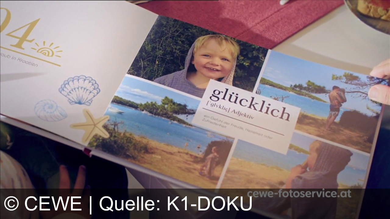 Ein Fotobuch zeigt den Titel "glücklich" mit Bildern von einem lachenden Kind an einem See oder Meer. Links ist der Text "Urlaub in Kroatien" mit Muschel- und Seestern-Motiven. Unten rechts Logo "cewe-fotoservice.at". Im Hintergrund liegt ein rotes Tuch, eine Hand hält die Seite.