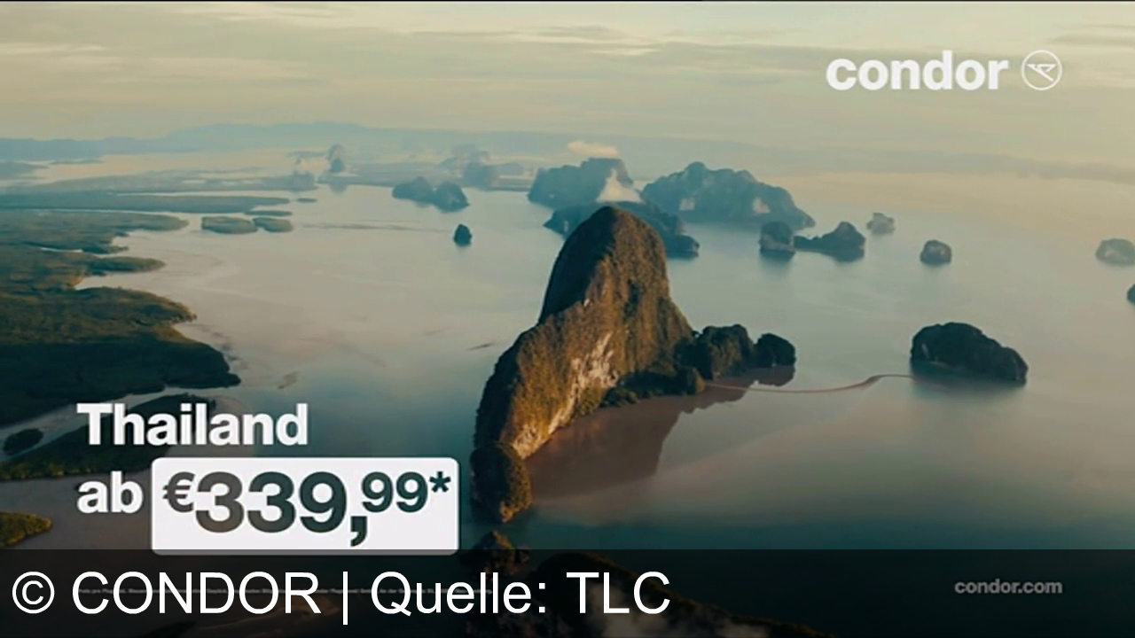 Condor bewirbt Flüge nach Thailand ab 339,99 €. Der Spot zeigt Natur, Kultur und Urlaubsatmosphäre und vermittelt: Wenn dich die Sehnsucht packt, ist jetzt der Moment zu buchen. Hinweis auf weltweite Ziele und Buchung über condor.com.