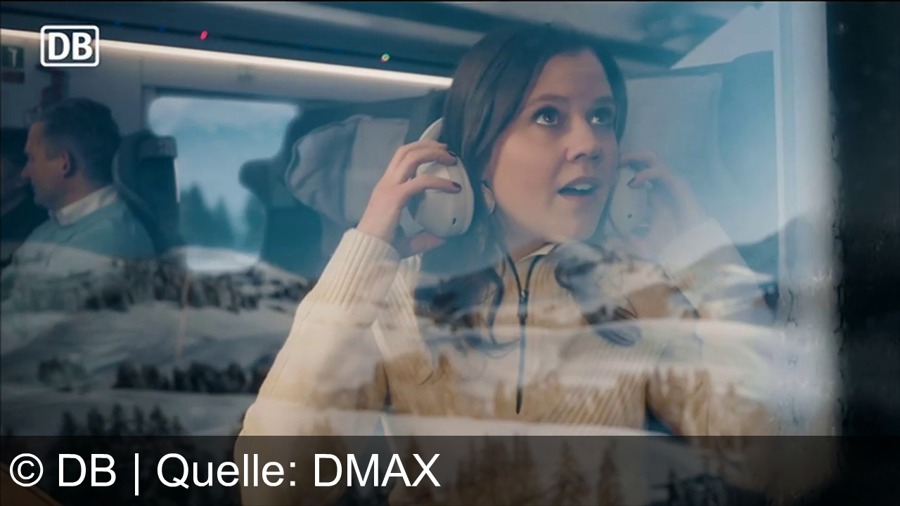 Eine Frau mit Kopfhörern sitzt im Zug. Sie schaut interessiert aus dem Fenster. Draußen sind verschneite Berge und Tannen zu sehen. Oberhalb des Bildes steht "DB". Links sitzt ein Mann im hellen Pullover, er redet mit jemandem. Der Zug wirkt modern und gemütlich.