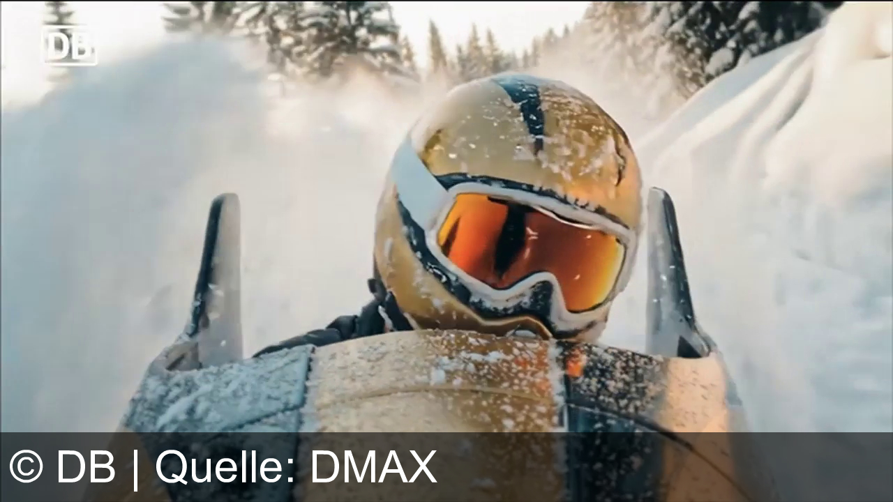 Eine Person trägt einen goldenen Helm und eine Skibrille mit orangenen Gläsern. Umgeben von Schnee, sitzt die Person in einem Bob. Im Hintergrund sind schneebedeckte Bäume unter einem blauen Himmel. Links oben ist ein Logo mit den Buchstaben "DB".