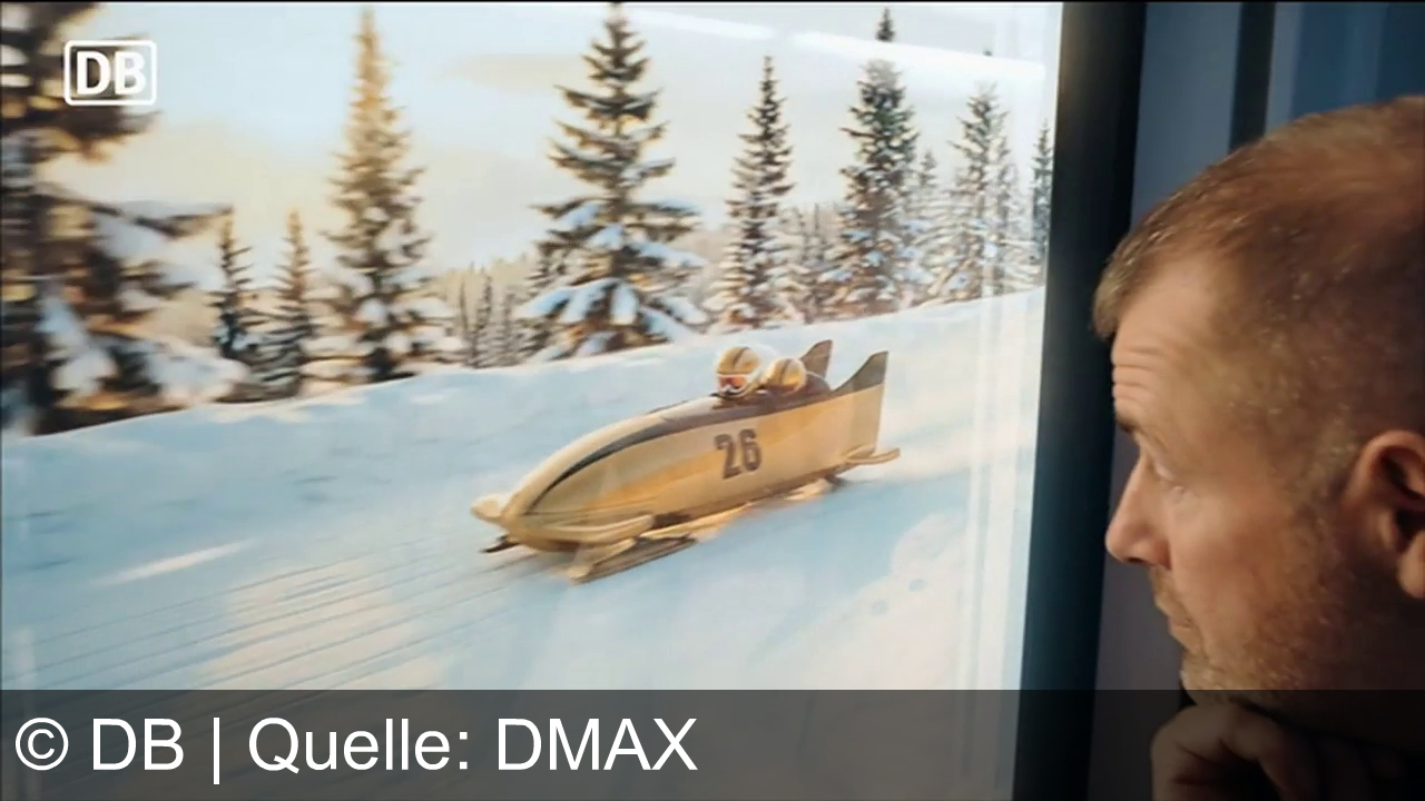 Ein Bob mit der Nummer 26 rast durch eine Schneelandschaft, umgeben von verschneiten Tannen. Zwei Personen tragen Helme darin. Am rechten Bildrand schaut ein Mann durch ein Fenster in Richtung des Bobs. Oben links im Bild befindet sich das DB-Logo.