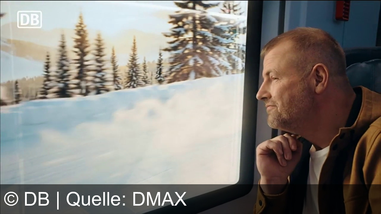 Ein Mann mit Bart und Rollkragenpullover sitzt im Zug und schaut aus dem Fenster. Draußen ist eine Winterlandschaft mit verschneiten Bergen. Ein Skispringer fliegt im Hintergrund durch die Luft. Oben links im Bild befindet sich ein DB-Logo.
