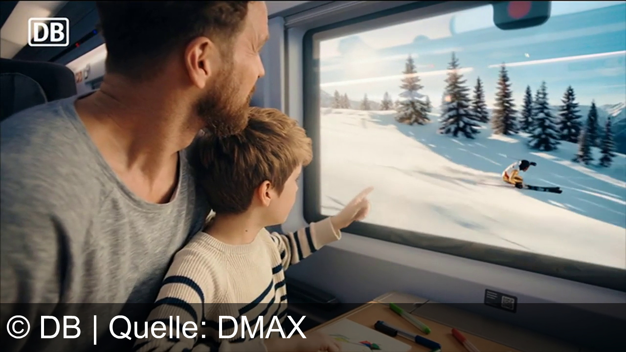 Ein Mann und ein Junge sitzen in einem Zugabteil. Der Junge zeigt aus dem Fenster auf eine verschneite Winterlandschaft, wo ein Skifahrer im Schnee fährt. Auf dem Tisch liegen bunte Stifte und Papier. Oben links befindet sich ein Logo mit den Buchstaben "DB".