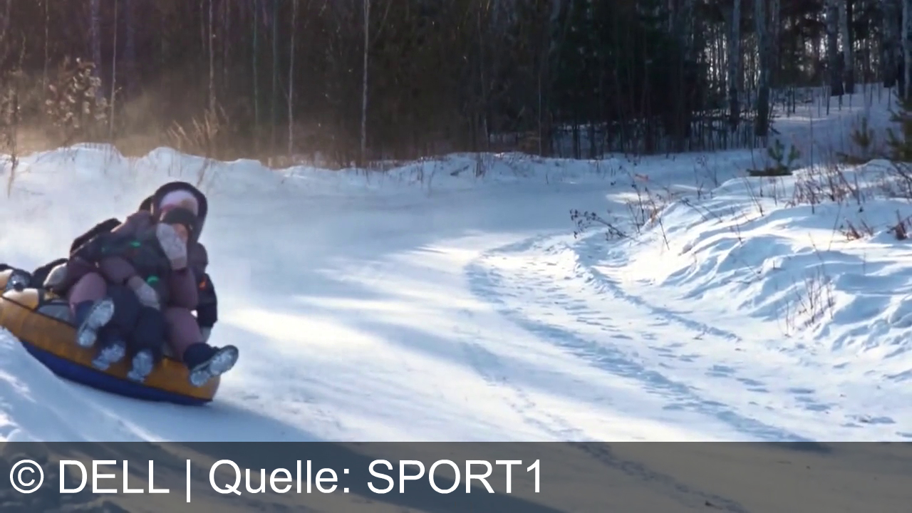 Im Schnee rasen zwei Personen zusammen auf einem aufblasbaren Schlauchboot eine Piste hinunter. Beide tragen Winterkleidung und Mützen. Die Umgebung ist verschneit und gesäumt von Bäumen. Es liegt eine winterliche Atmosphäre in der Luft.