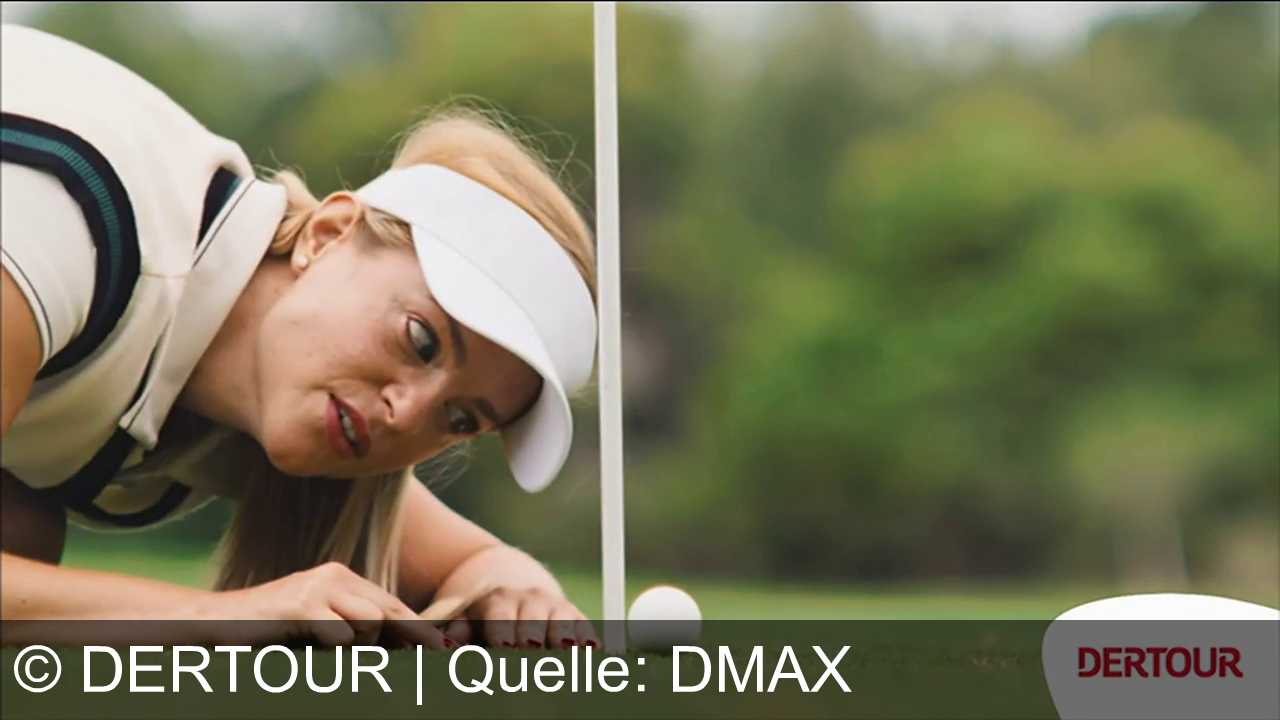 Eine Frau mit weißem Visor liegt am Boden auf einem Golfplatz. Sie blickt konzentriert auf einen Golfball neben dem Loch. Ein grüner Hintergrund ist verschwommen. Rechts unten steht "DERTOUR".