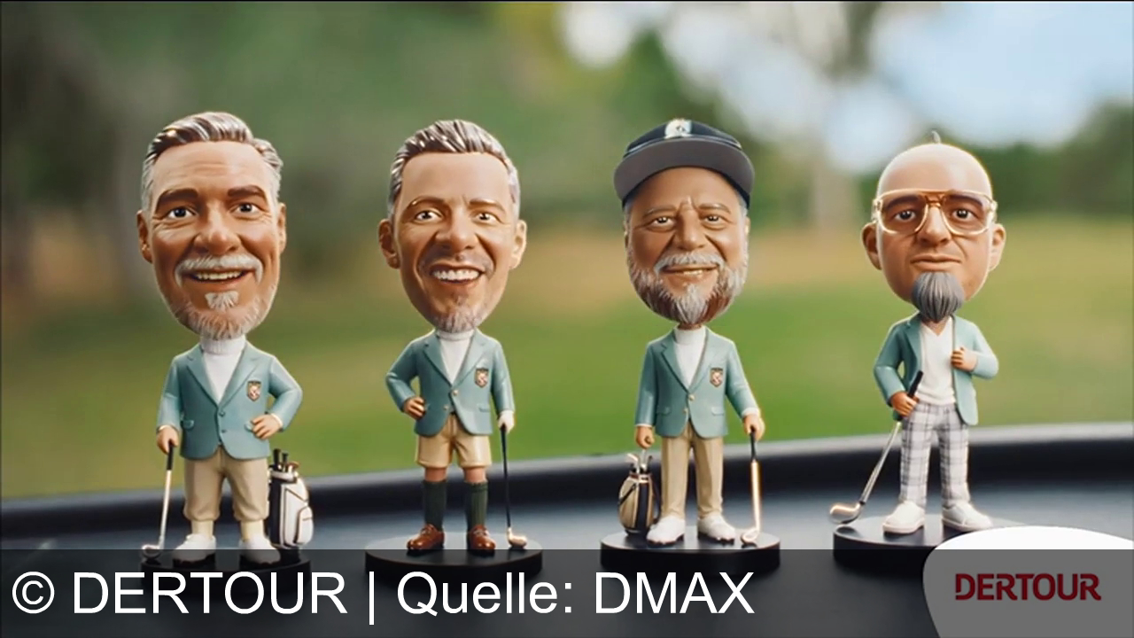 Vier Wackelkopf-Figuren stehen nebeneinander, alle tragen grüne Jacken und Golf-Outfits. Jede Figur hält einen Golfschläger. Die Umgebung wirkt wie ein Golfplatz. Unten rechts ist das Logo von "DERTour" zu sehen.