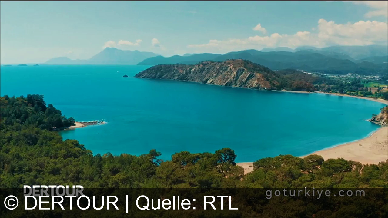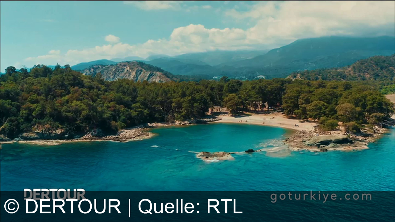 Eine Küstenlandschaft mit klarem blauem Wasser, umgeben von grünen Bäumen im Vordergrund. Eine Halbinsel streckt sich ins Meer. Über dem Horizont erheben sich Berge. Unten links steht "DERTOUR", unten rechts "goturkiye.com". Der Himmel ist klar mit ein paar vereinzelten Wolken.