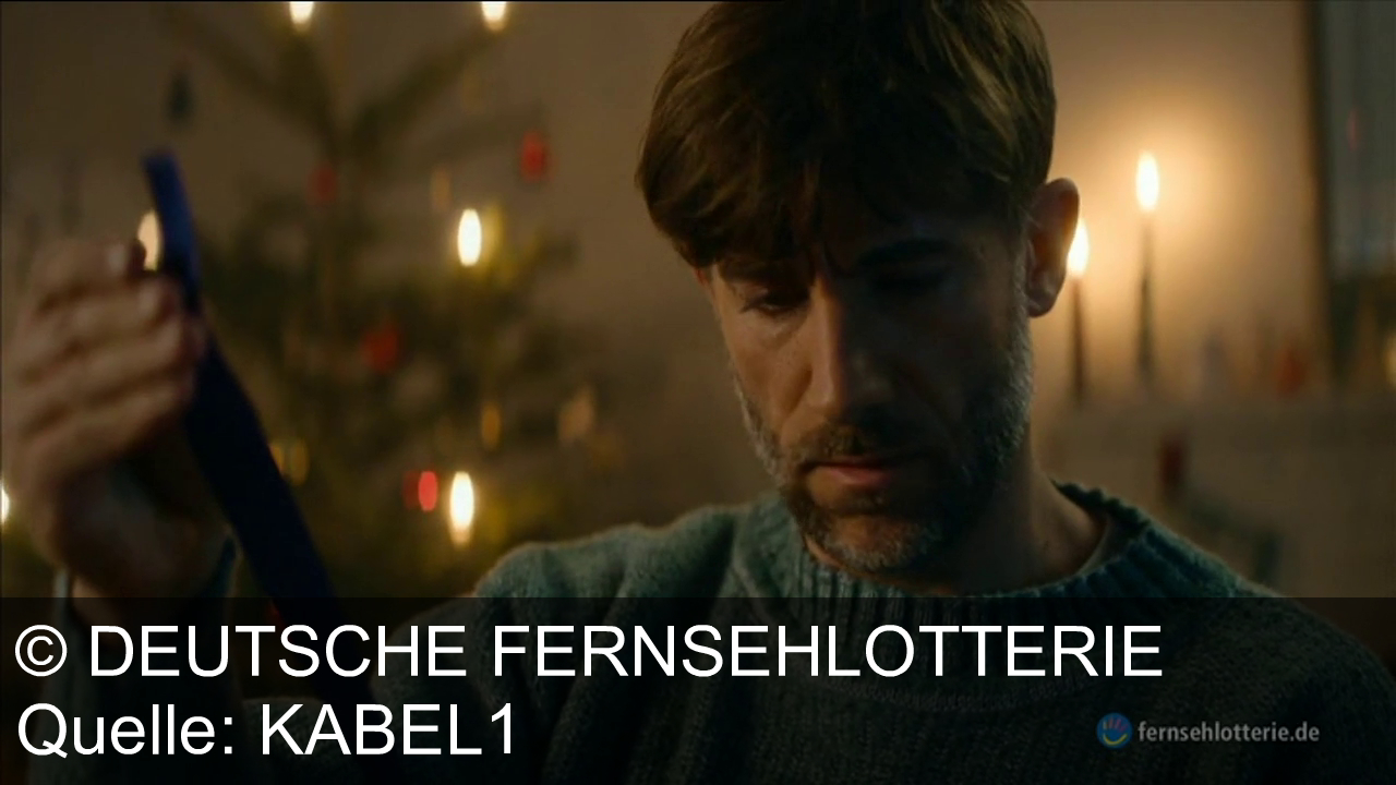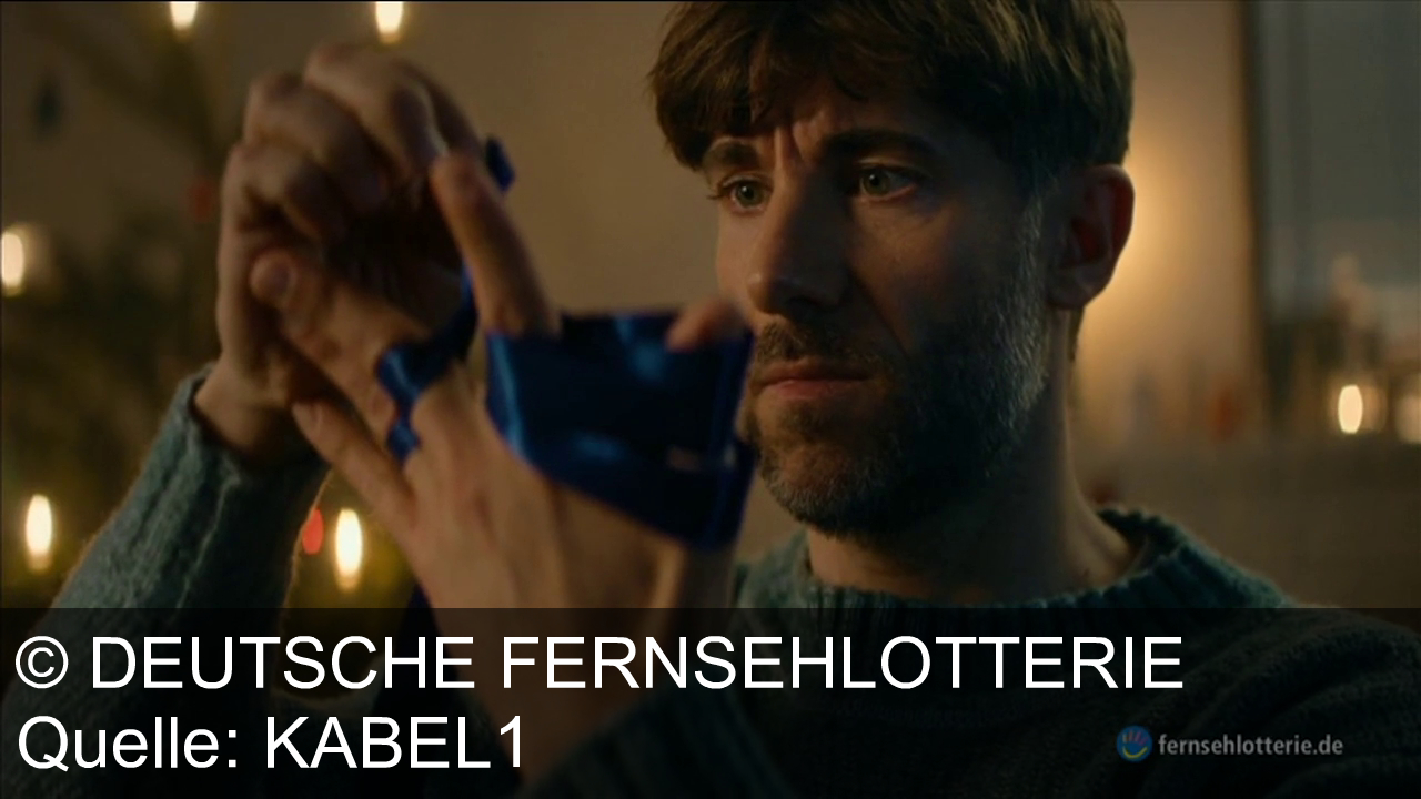 Ein Mann mit Bart schaut auf einen Gegenstand in seiner Hand. Er trägt einen blauen Pullover. Im Hintergrund ein unscharfer Weihnachtsbaum mit Lichtern. Schneidige Beleuchtung erzeugt eine warme Atmosphäre. Logo "fernsehlotterie.de" unten rechts.