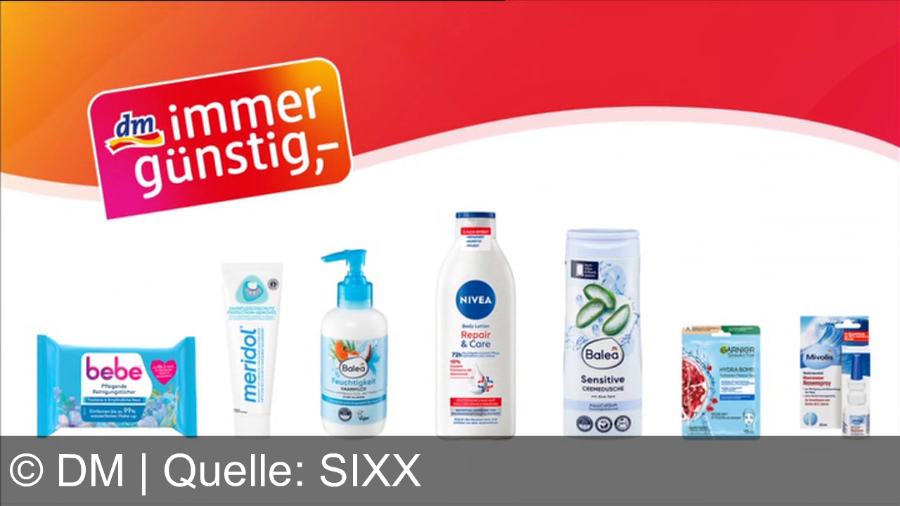 Oben links steht "dm immer günstig" auf einem rot-orangefarbenen Hintergrund. Darunter sind sieben Pflegeprodukte nebeneinander angeordnet: Bebe Reinigungstücher, Meridol Zahncreme, Balea Flüssigseife, Nivea Body Lotion, Balea Cremedusche, Garnier Tuchmaske und Mivolis Nasenspray. Der Hintergrund ist schlicht weiß.