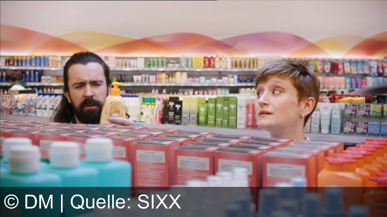 Zwei Personen stehen in einem Drogeriemarkt vor einem Regal mit bunten Verpackungen. Im Vordergrund sind Flaschen in verschiedenen Farben, im Hintergrund Regale mit Kosmetikprodukten. Der Mann mit langen dunklen Haaren schaut ernst, während die Frau mit kurzem Haar lächelt. Die Wände sind pastellfarben dekoriert.